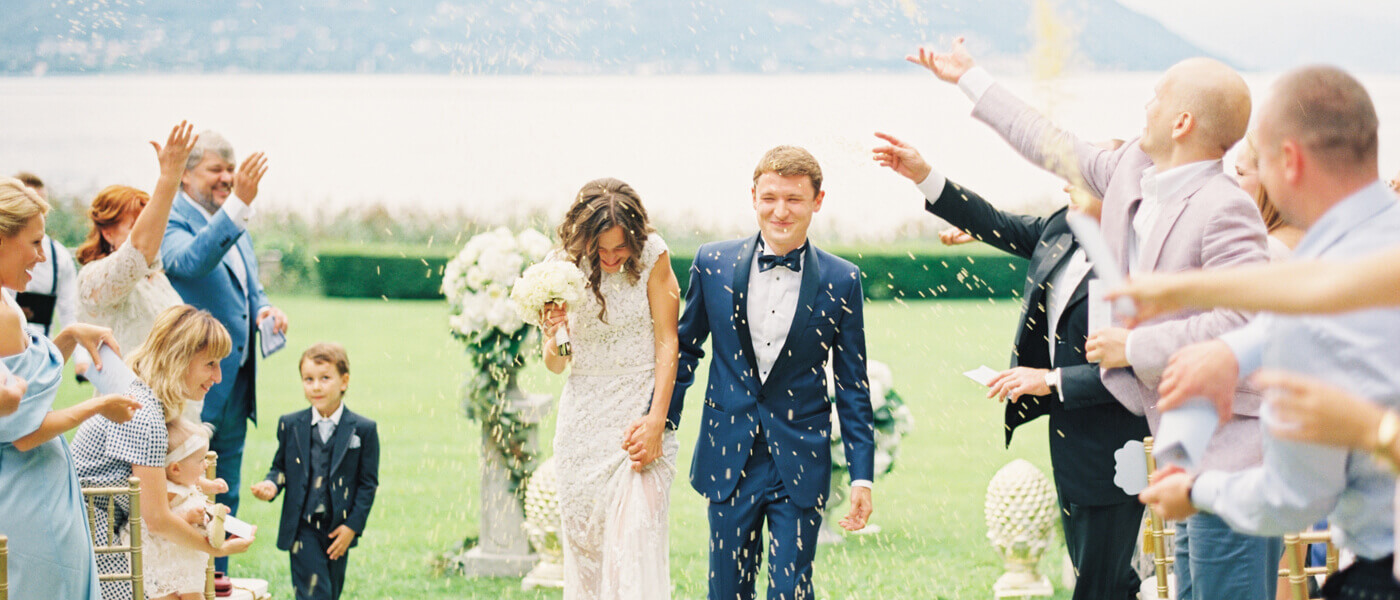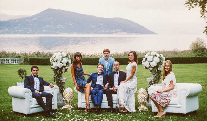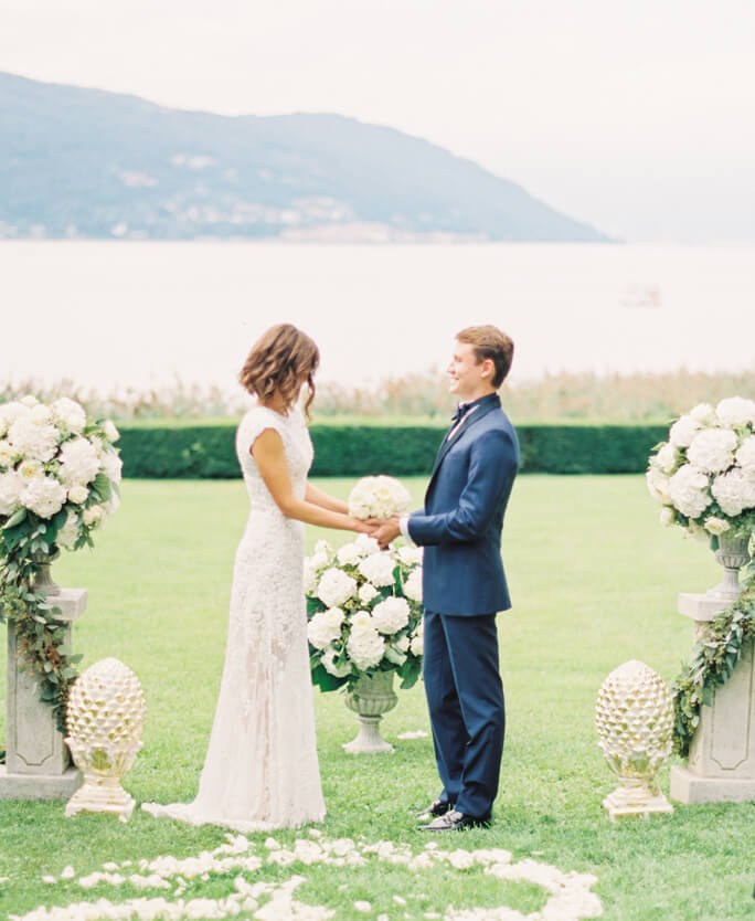 Церемония проходила на берегу озера Маджоре с открывающимся видом на горные пейзажи. Завораживающая природа Италии, классическая и лаконичная архитектура местных вилл - все вокруг и есть одна элегантная и неповторимая композиция, которую мы продолжили и гармонично дополнили свадебными декорациями.