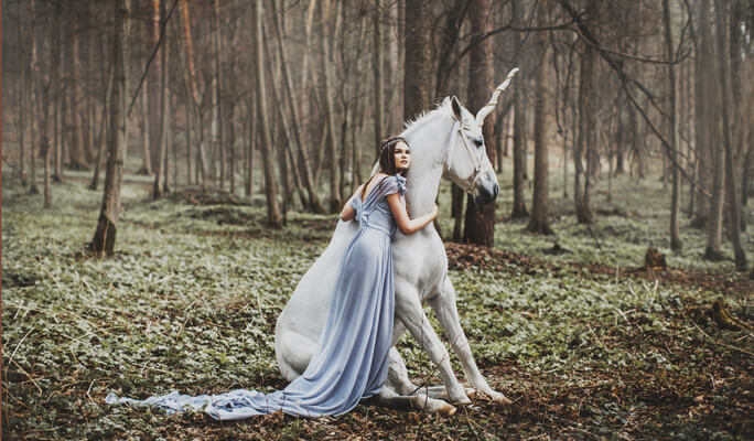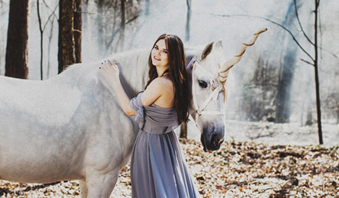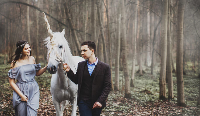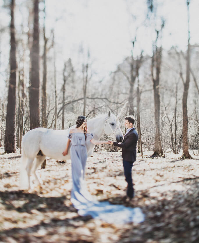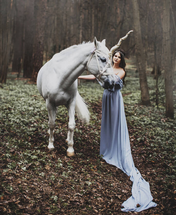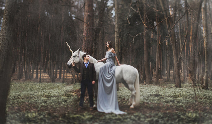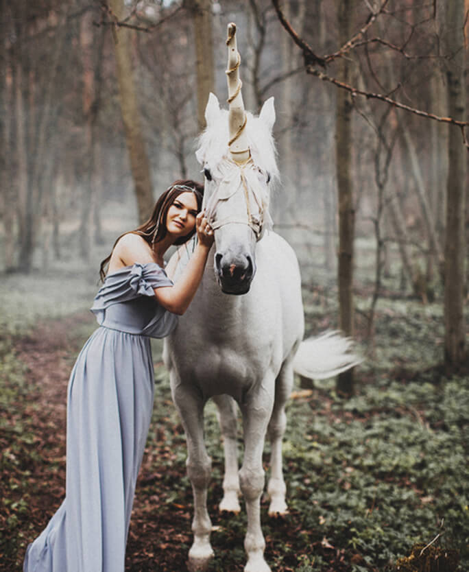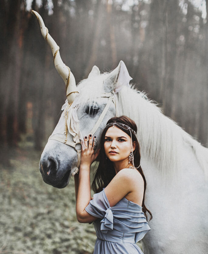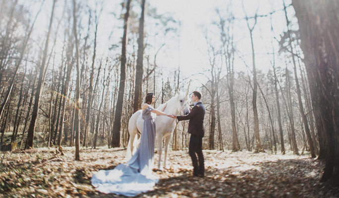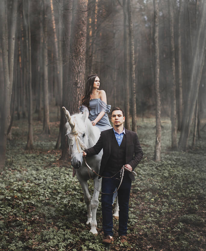 Мы с Геной уже больше 8 лет вместе и это наша первая такая большая фотосессия. Все было как в сказке: мы, настоящий единорог с человеческими глазами, волшебный лес. Гена вел единорога, на котором я сидела сверху и я ощущала себя настоящей лесной нимфой, которая встретила своего Prince Charming. По своему опыту поняла, что нужно идти на любые съемки - это очень трогательные акценты на свадьбе, которые к тому же остаются с вами навсегда.
