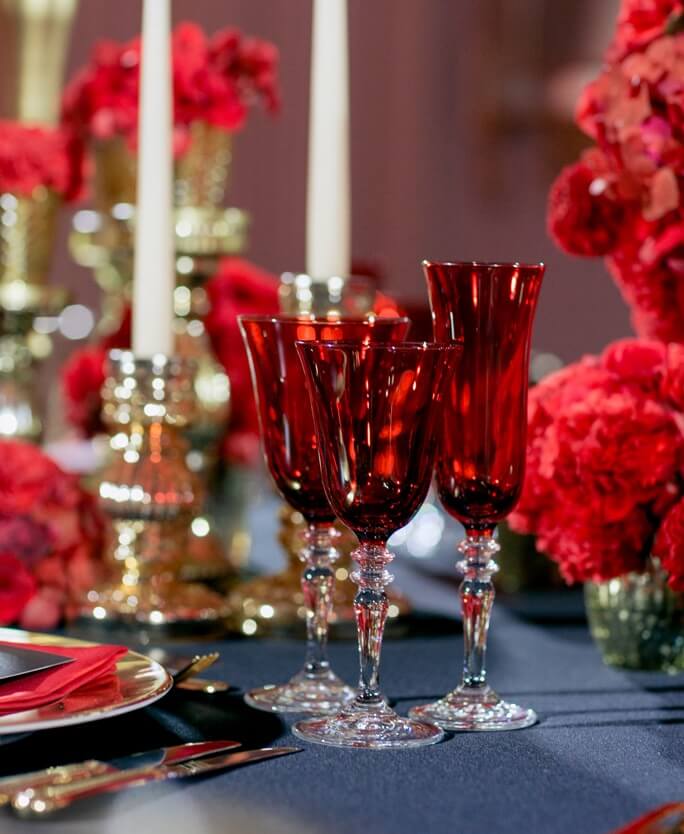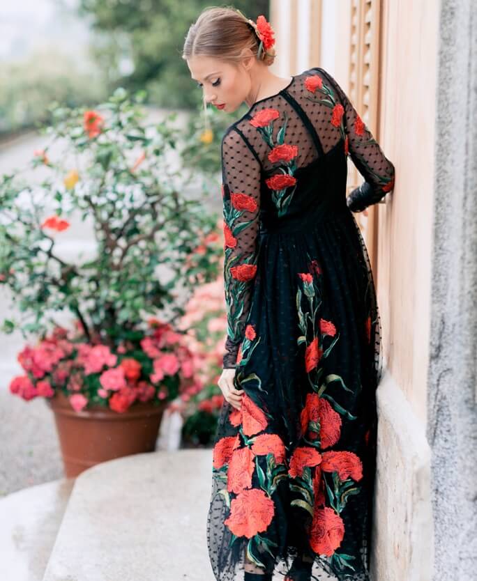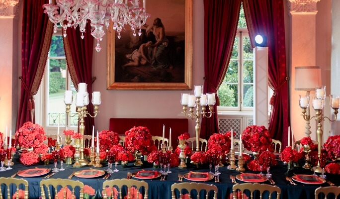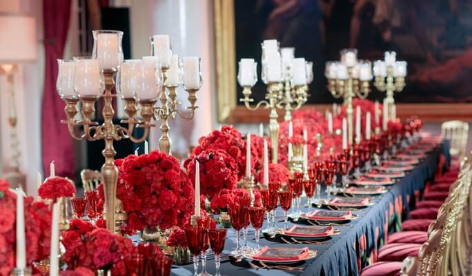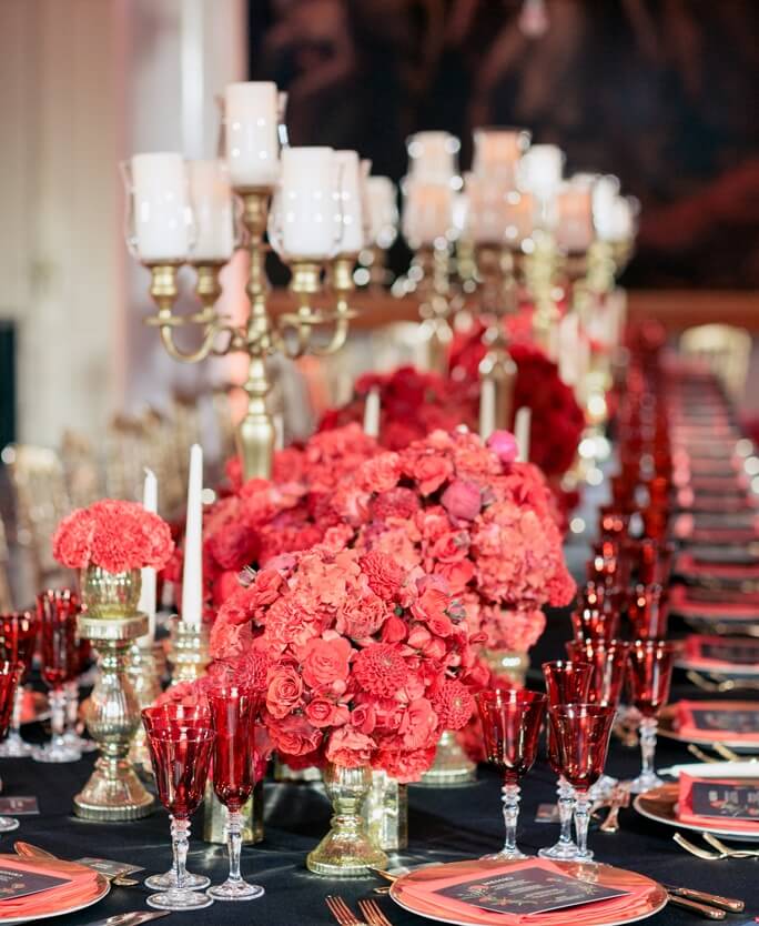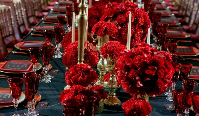 Чтобы точно выдержать выбранный стиль даже во флористике, накануне декораторы окрасили цветы разных сортов в однородный ярко-красный цвет, который встречается в природе очень редко. Чтобы подчеркнуть атмосферу семейного торжества по-итальянски, невеста выбрала для себя платье от Dolce&Gabbana.