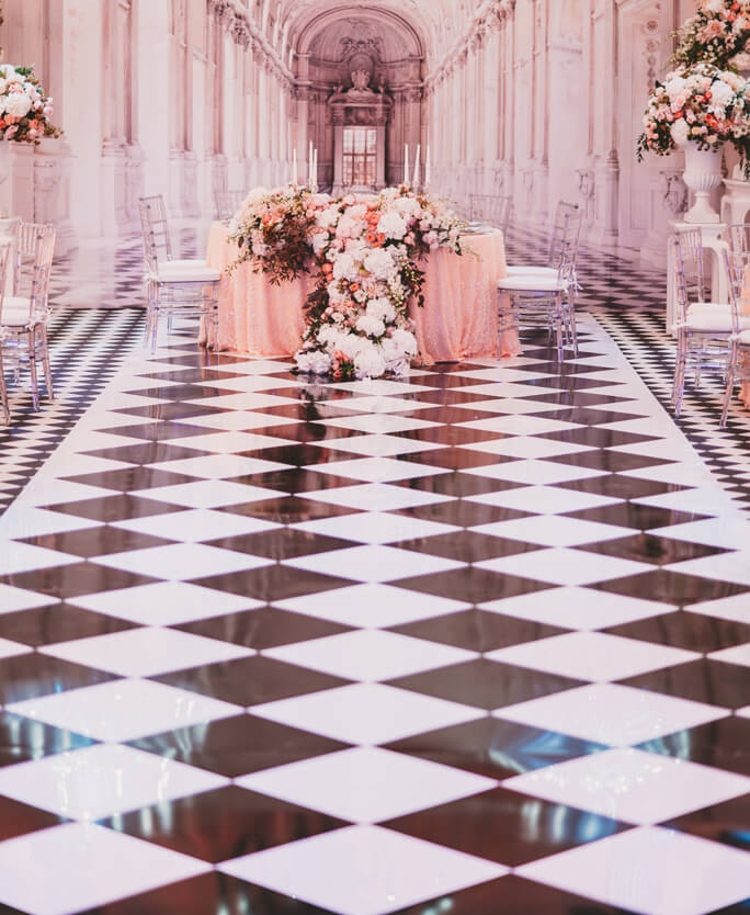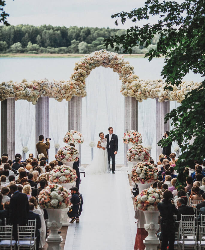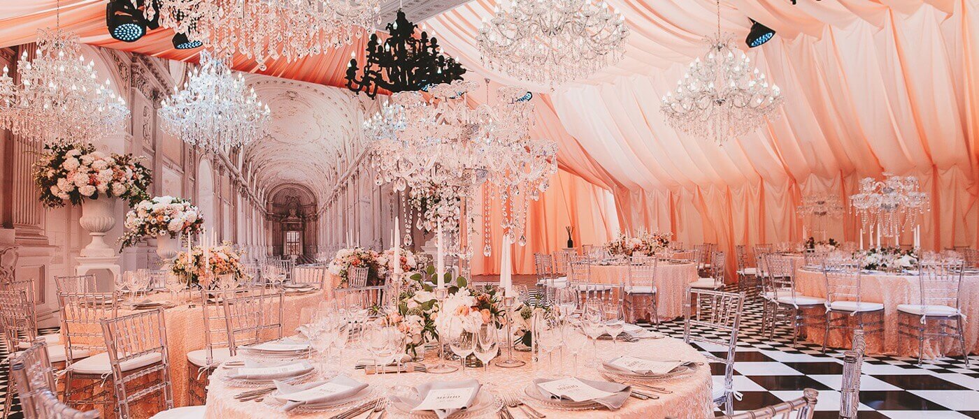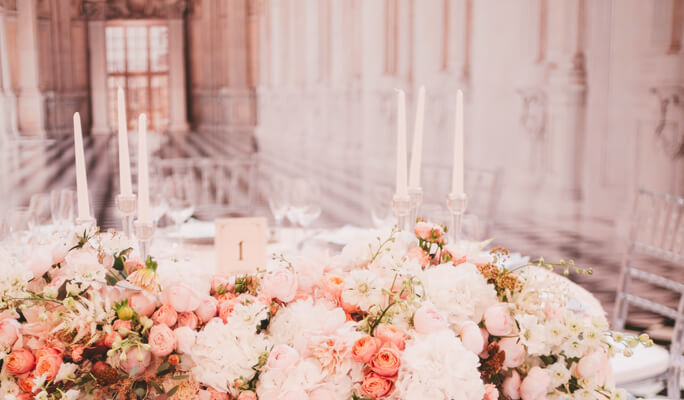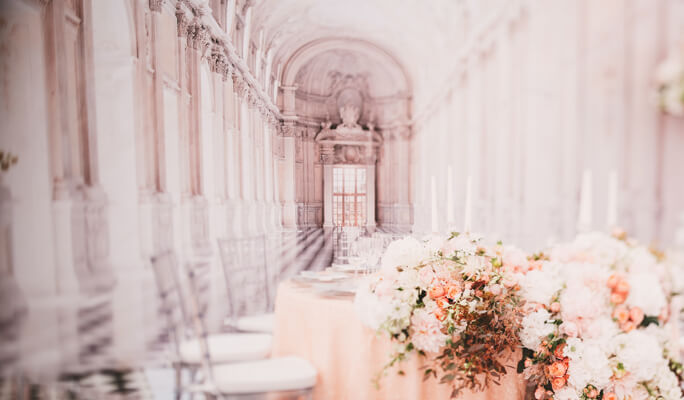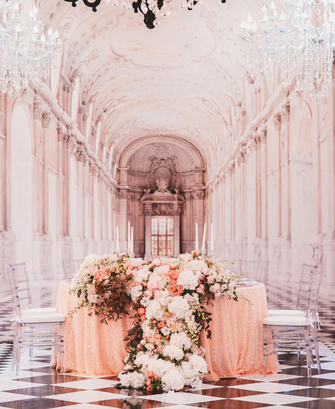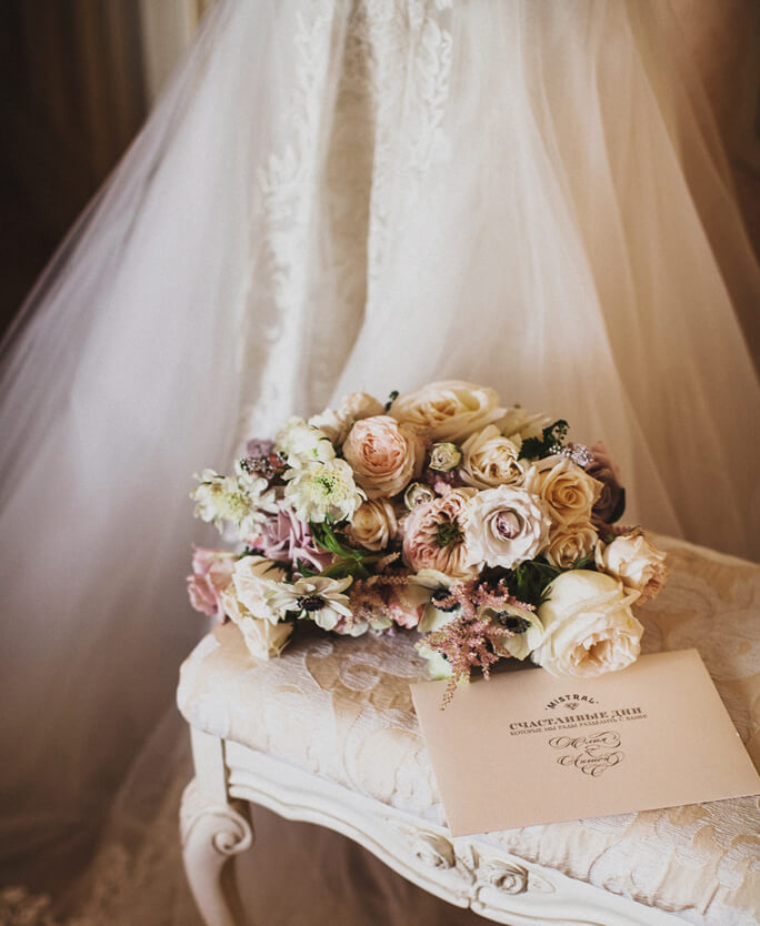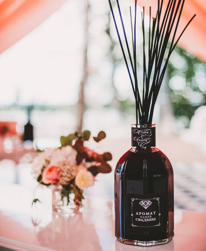 Стилистика свадьбы родилась не случайно – история семьи невесты связана с драгоценными камнями, так символом свадьбы стали кристаллы, а само пространство было оформлено в стиле французской эклектики с величественными залами, перспективой и индивидуальным ароматом, созданным специально для этого события.