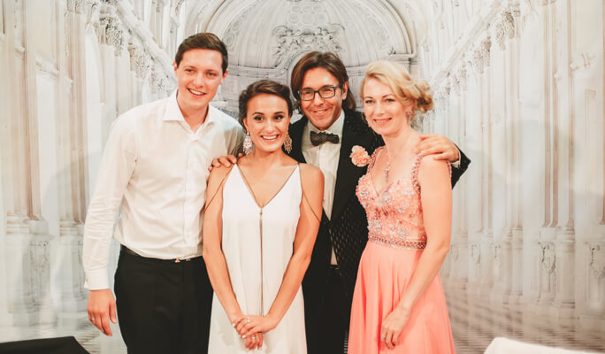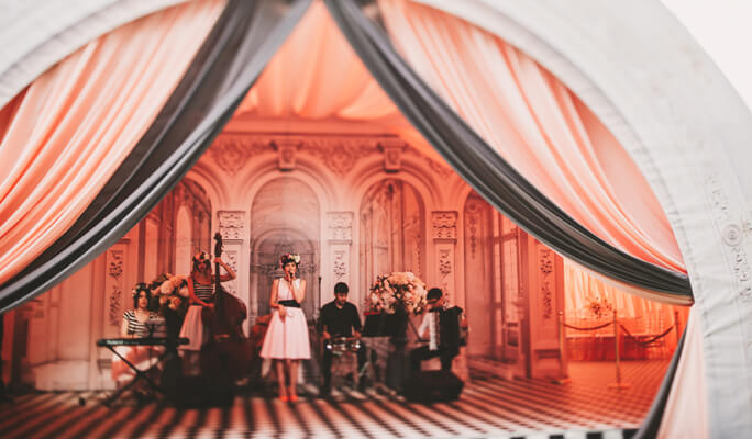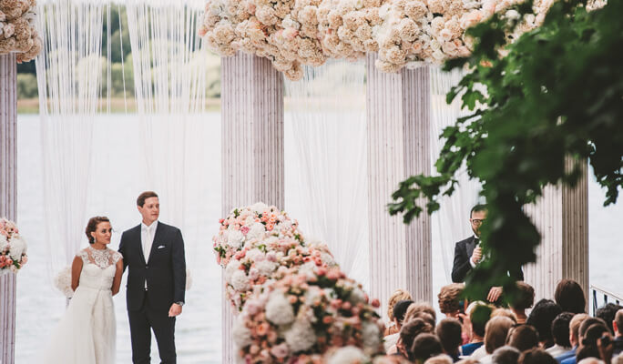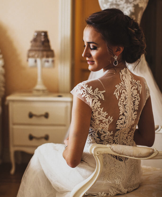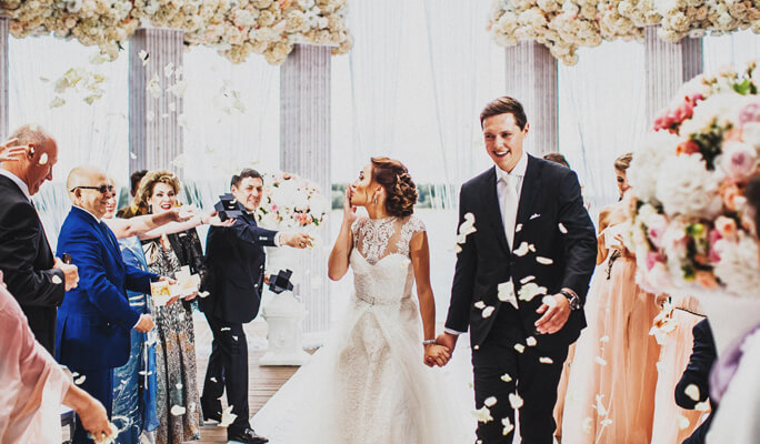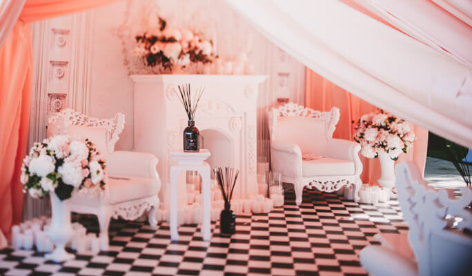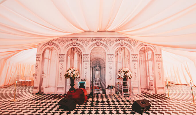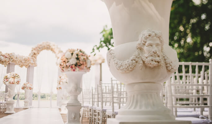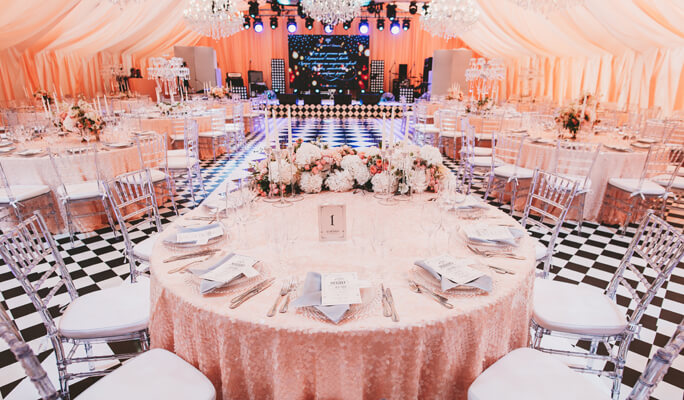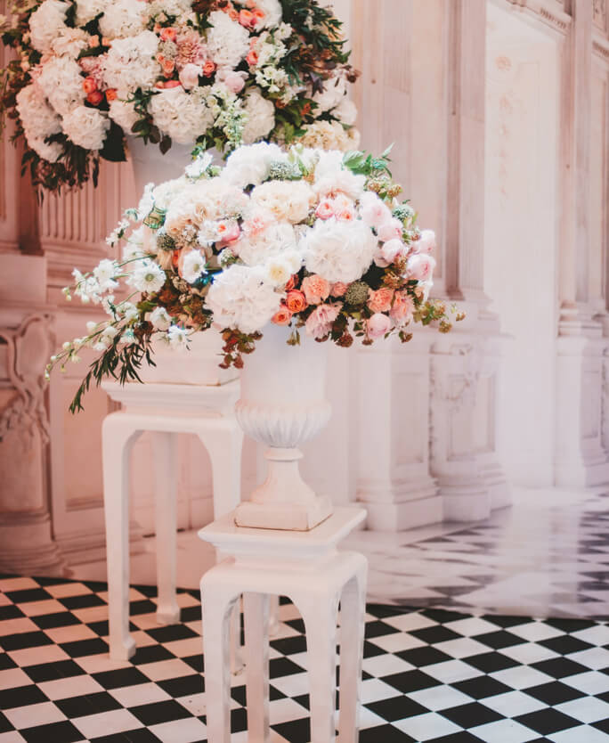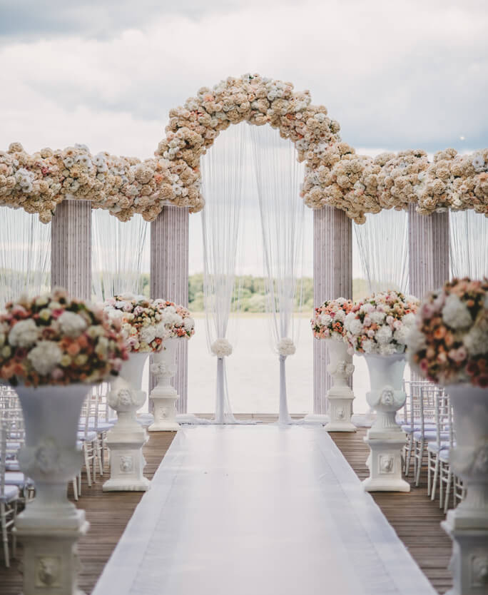 Стилистика свадьбы родилась не случайно – история семьи невесты связана с драгоценными камнями, так символом свадьбы стали кристаллы, а само пространство было оформлено в стиле французской эклектики с величественными залами, перспективой и индивидуальным ароматом, созданным специально для этого события.