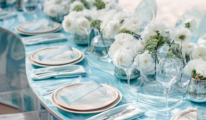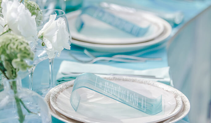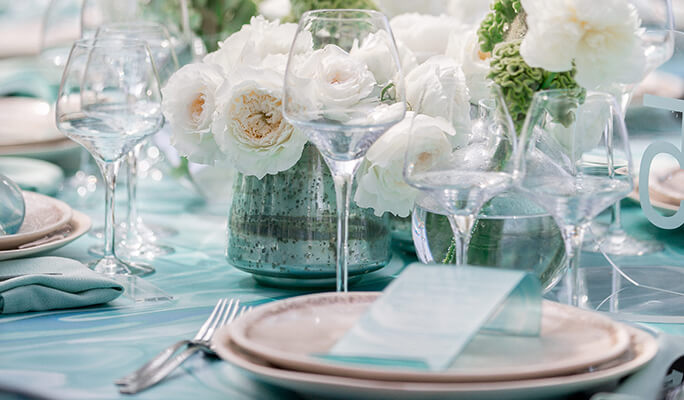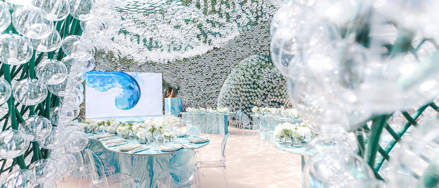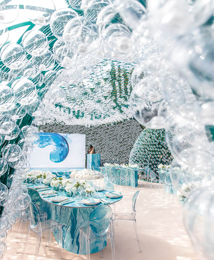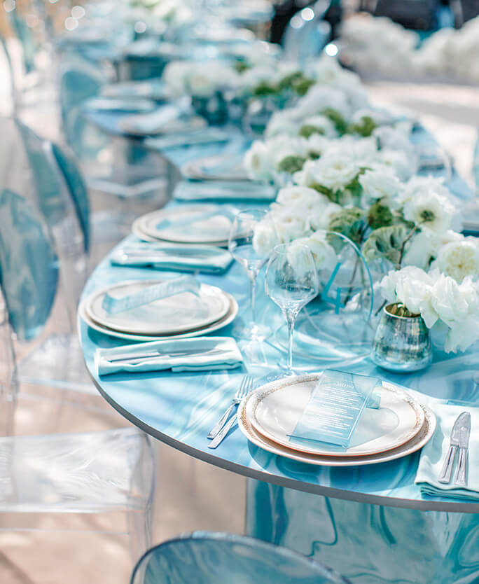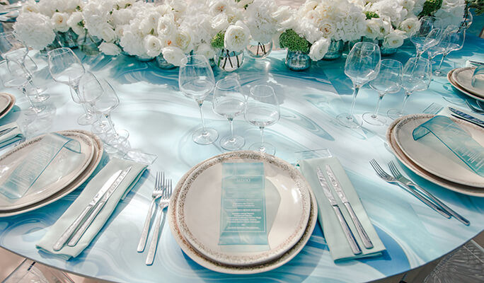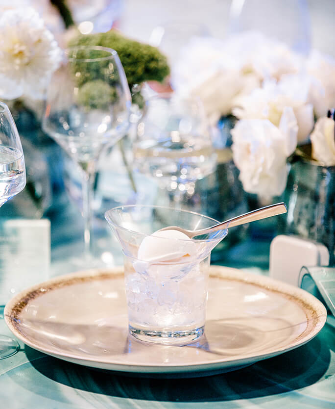 Необычные столы, которые сами становились арт-объектами, были изготовлены индивидуально под мероприятие. Белоснежная флористика напоминала морскую пену, а экспериментальное меню, маленькими изумрудными волнами поднималось над сервировкой.