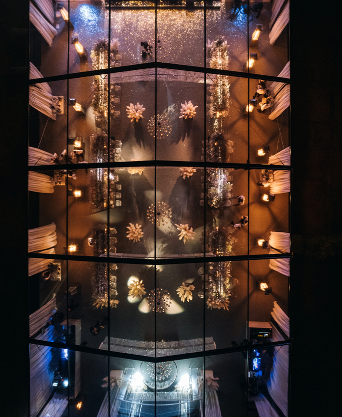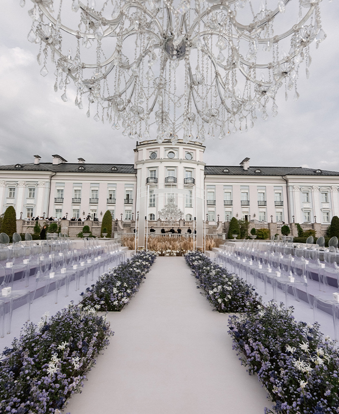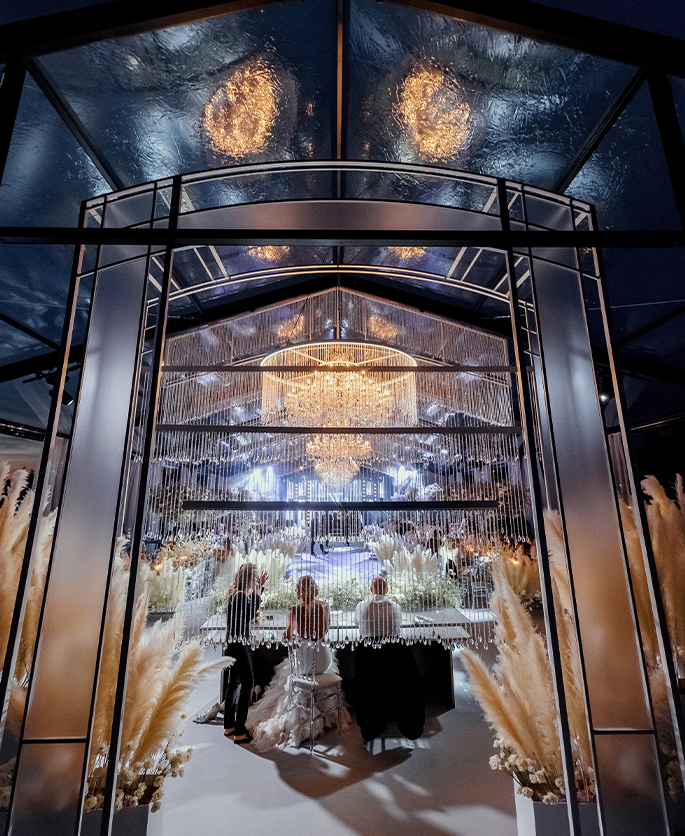 Основные зоны были украшены множеством сухоцветов. Полупрозрачные арки, хрустальные люстры, словно подвешенные в воздухе - все это было нежно, красиво и при этом действительно масштабно.
