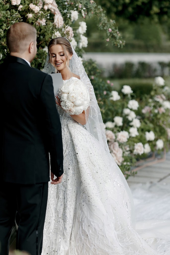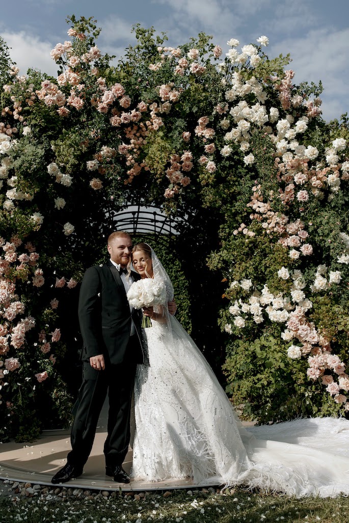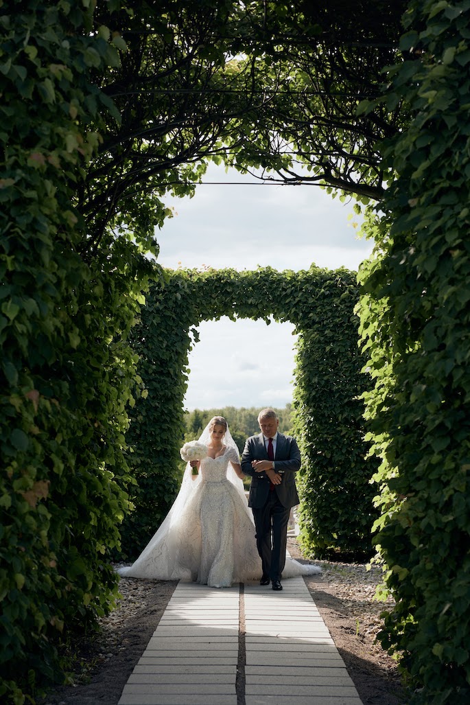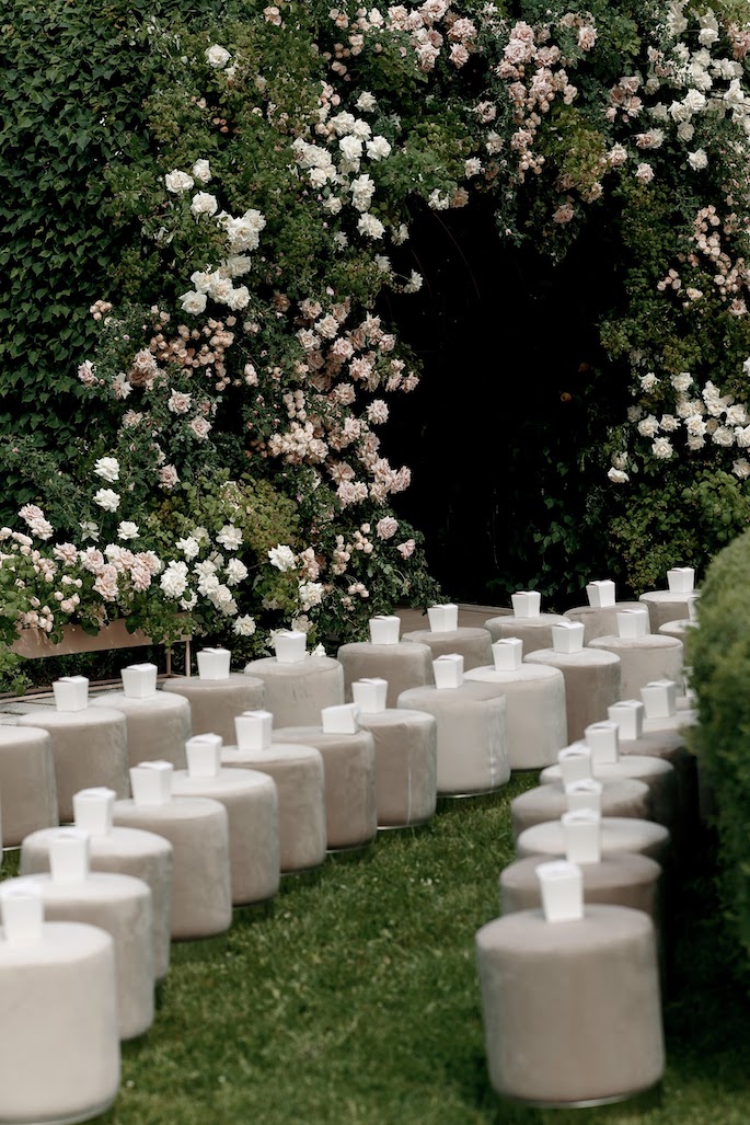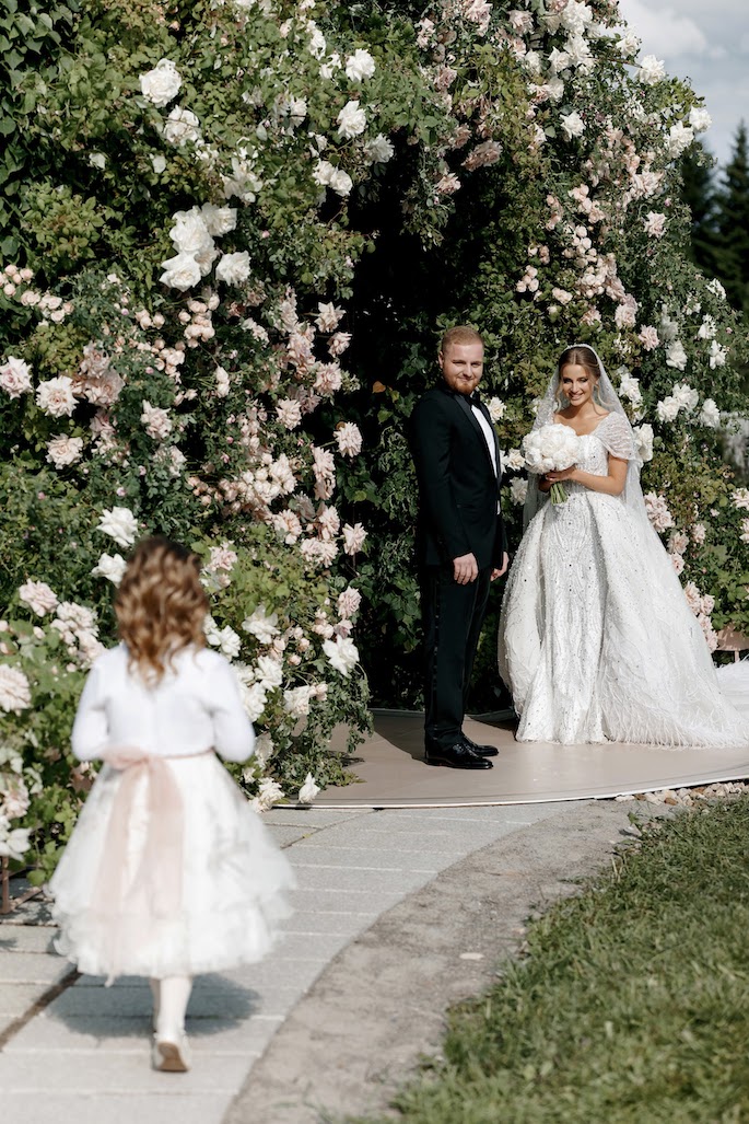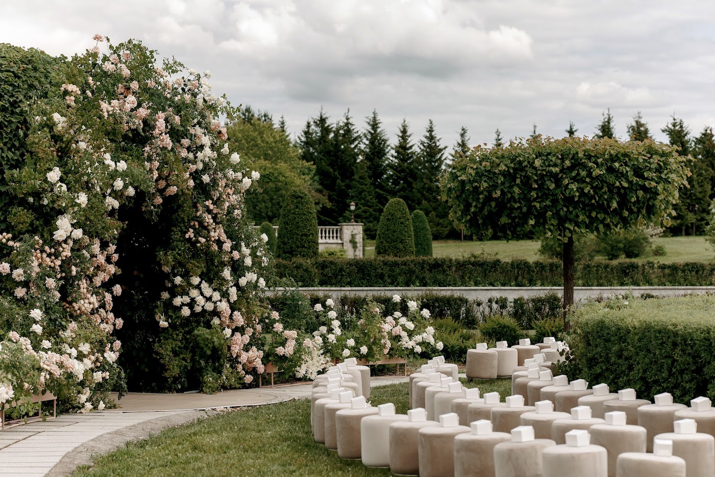 Как правило, арку для проведения церемонии, застраивают в зоне большого фонтана, чтобы вилла служила красивым фоном для главного момента всего дня. Но мы решили пойти довольно нестандартным путем и провели церемонию в саду, где украсили естественный ландшафт живыми цветами в пастельной гамме. Получилось очень естественно и нежно, будто таким сад и был до нас, а мы очень любим, когда нам удается добиться такого эффекта.