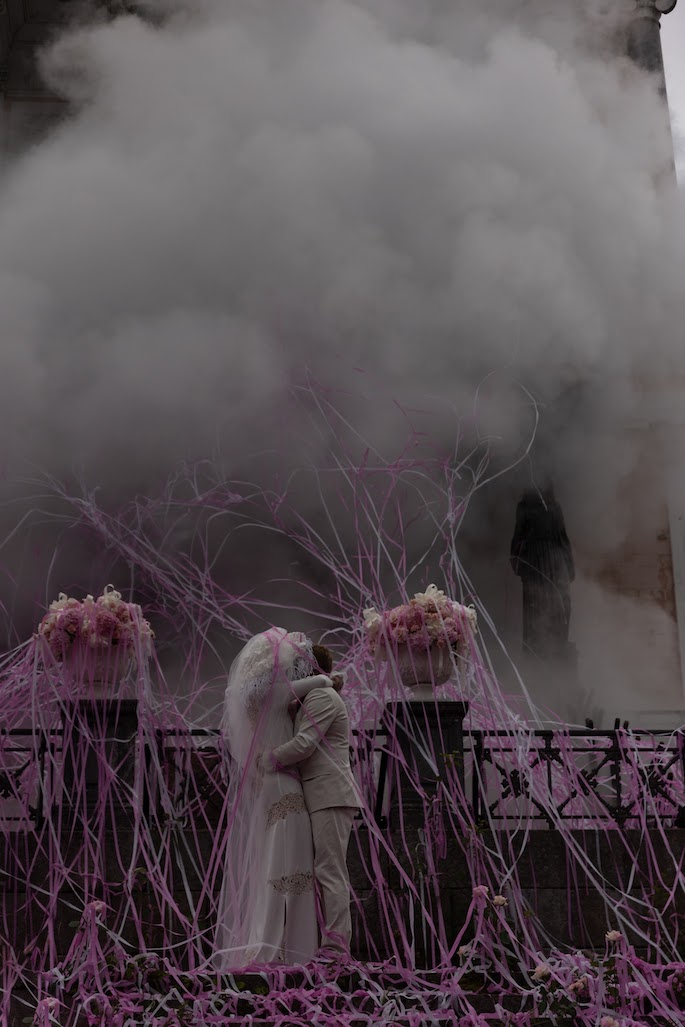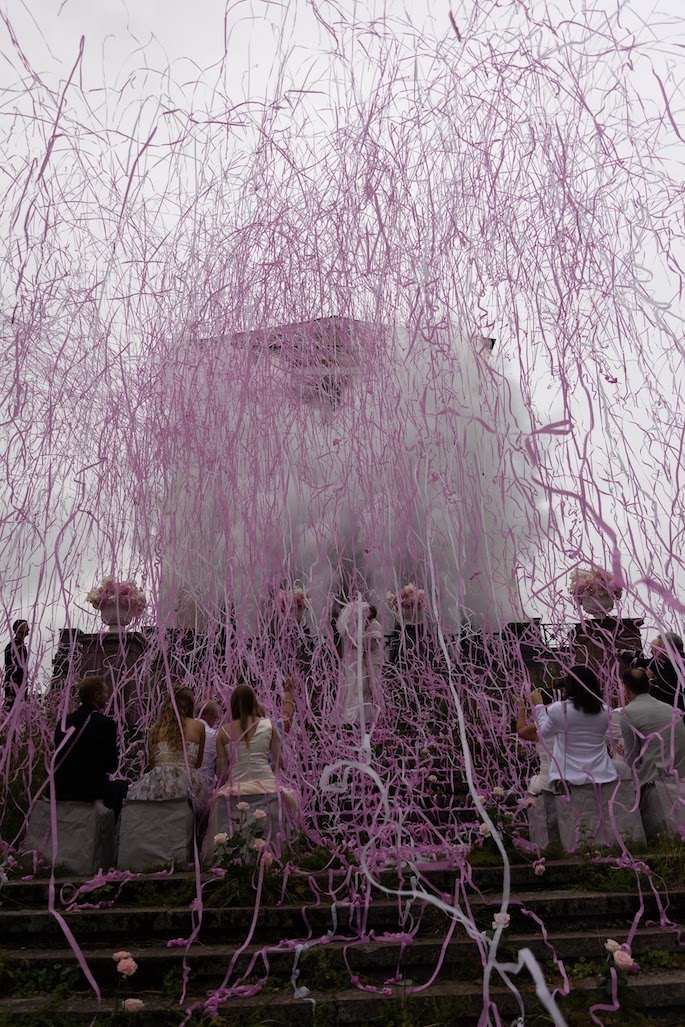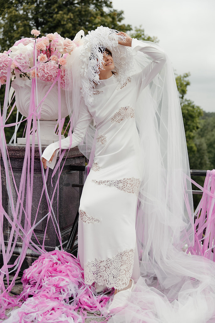 На этом проекте случилась не церемония, а разрыв! Давно мечтали сделать именно такую церемонию с настоящей феерией из серпантина и крио-пушек. Получилось выпустить более двух тысяч серпантинок и создать однотонное пасмурное небо, погрузив Дворец Бельведер в пелену серой дымки.