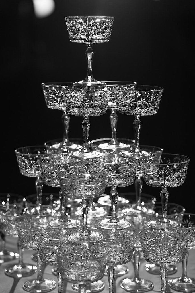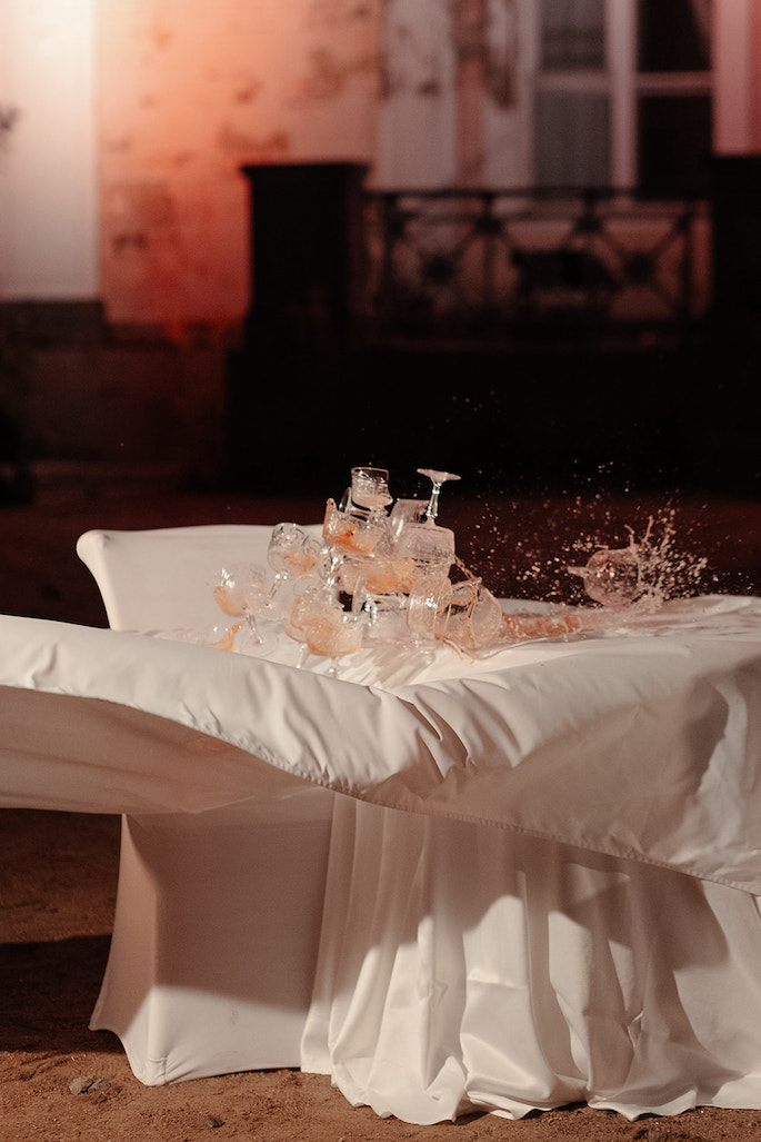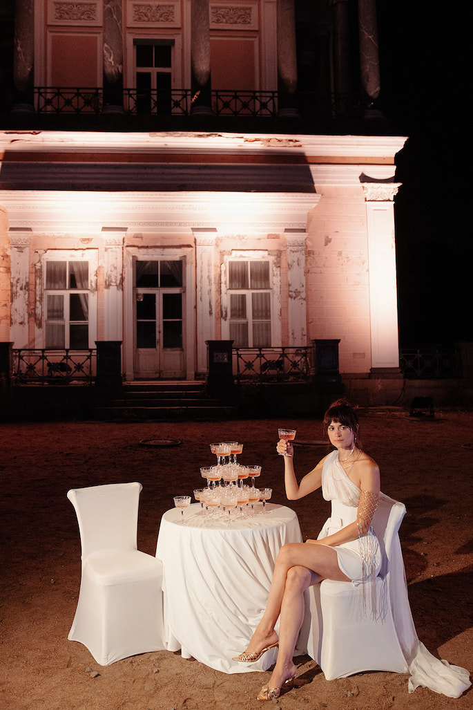 А дальше ребята встали из-за стола и Настин шлейф от платья превратился в скатерть, на которой стояла пирамида шампанского. Как вы уже догадались, в конце она эффектно разбивается – на счастье!
