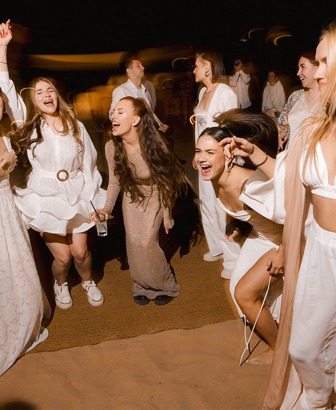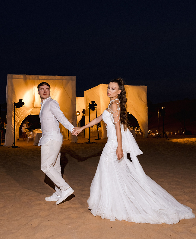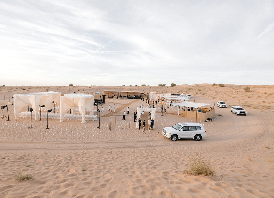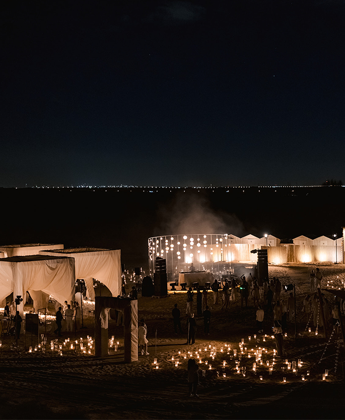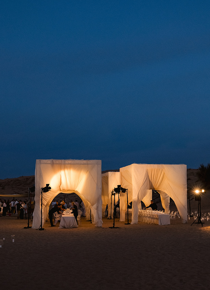 Как вы поняли, в яхт-клубе отеля BVLGARI все не закончилось. На следующий день мы переместили гостей в пустыню, сейчас расскажем, как это было. Ребята и их друзья обожают тусовки. Поэтому в пустыне мы устроили рейв посреди песчаных дюн под звездным небом. Песок, жара и лютый люкс — идеальные компоненты лавстори для свадьбы, которая происходит в Дубае.