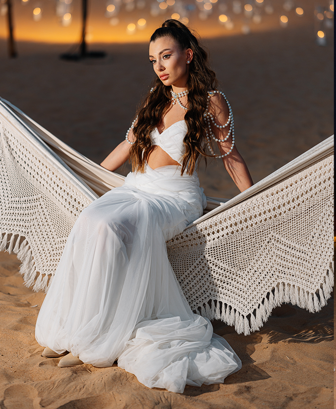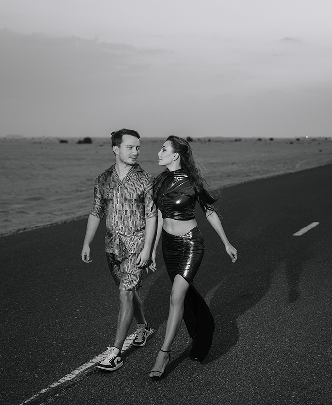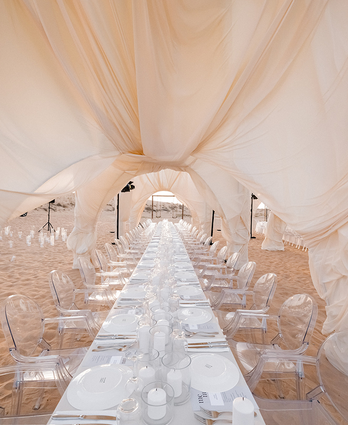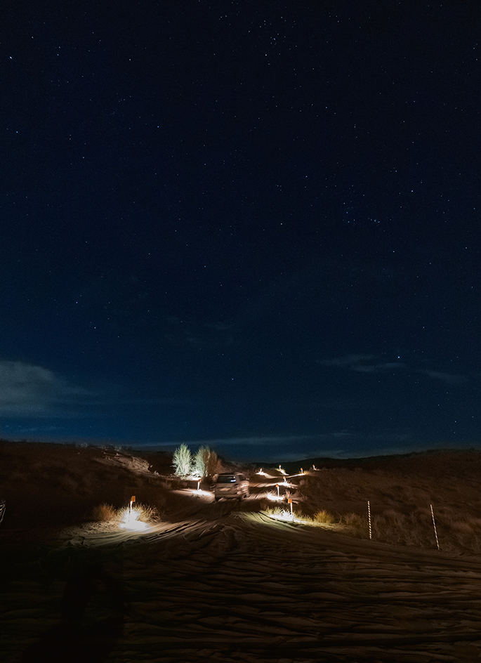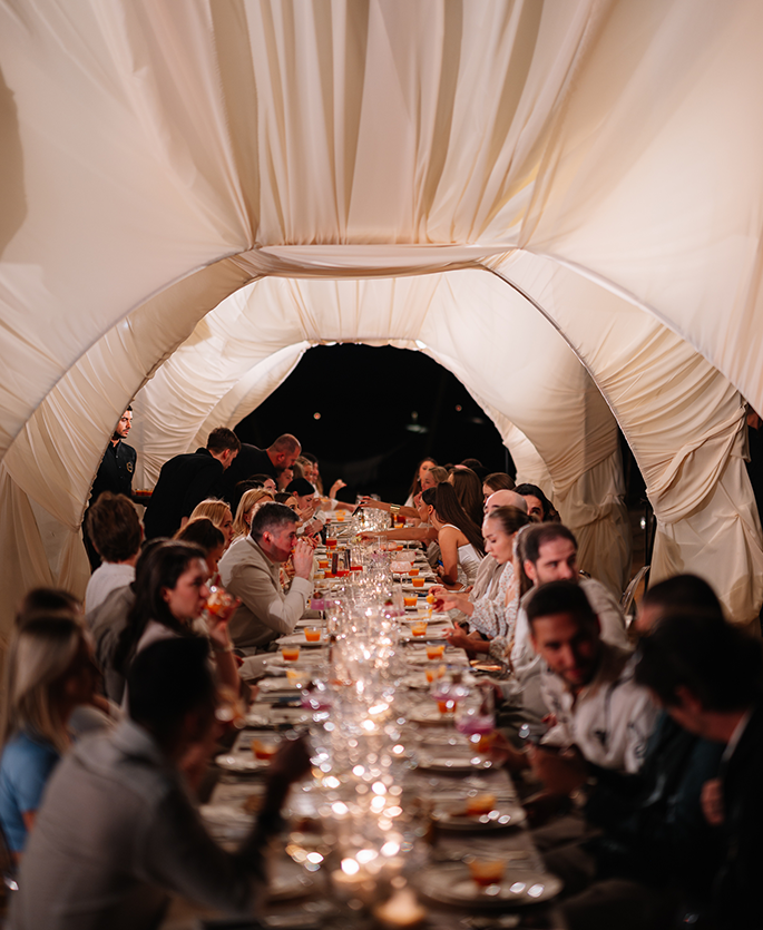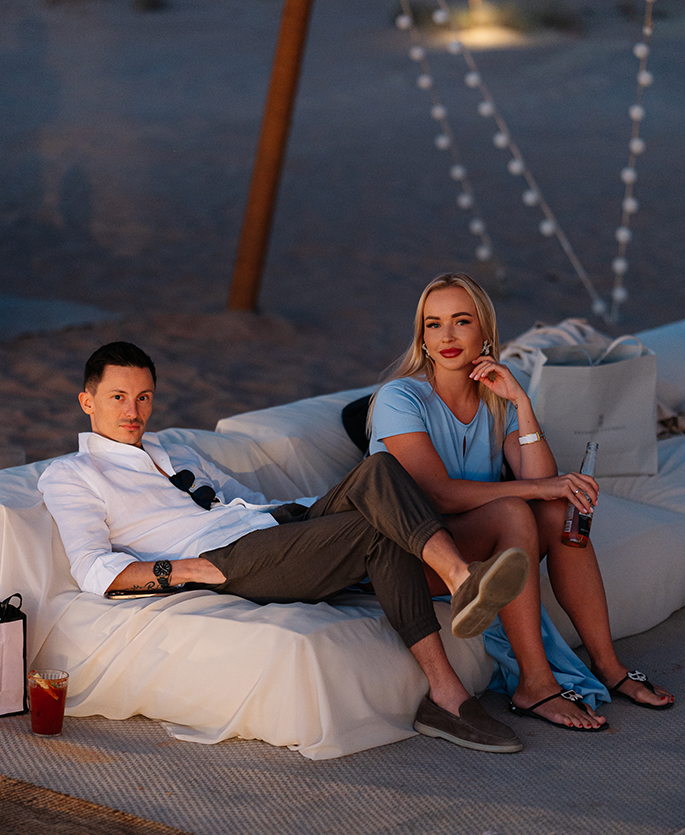 Как вы поняли, в яхт-клубе отеля BVLGARI все не закончилось. На следующий день мы переместили гостей в пустыню, сейчас расскажем, как это было. Ребята и их друзья обожают тусовки. Поэтому в пустыне мы устроили рейв посреди песчаных дюн под звездным небом. Песок, жара и лютый люкс — идеальные компоненты лавстори для свадьбы, которая происходит в Дубае.